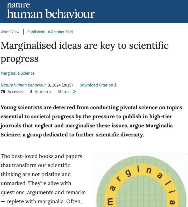 Marginalia Science. [Dietz, P., Gantman, A., Nam, H. H., Niemi, L.] (2019). Marginalised ideas are key to scientific progress. Nature Human Behaviour, 3, 1024.